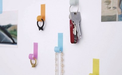这款挂钩的外形像扯下来的一段彩色胶带,有多种颜色可选。 外形简单、色彩艳丽的创意让人赞不绝口。产品材料为特质纸。在后面涂抹上水就可获得黏合力以便固定在墙上。
