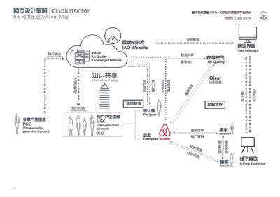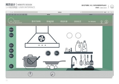 •设计者:陈楚怡 •专业:环境设计 •指导老师:朱小村、高懿理、钱栎 通过调研,设计者发现人的行为往往对室内的空气质量(IAQ)有重大的影响:吸烟、开窗通风、清洁都会成为影响到IAQ的因素。所以,通过认知影响空间使用者行为,从而提升IAQ,是一个间接却又有效的解决方式。 基于这样的初衷,网页以场景为概念,告诉人们身边存在哪些污染物,可以通过什么样的方式改善空气。通过不同场景的选择,利用网页与用户交互的优势,使场景能够动态化互动,以一种有趣的方式向大众传播知识信息。除了线上平台的搭建,借用此次毕业展览的契机,作为网页宣传推广的触发点,将网页知识结构更好地线下呈现。