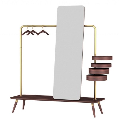 依据人性化使用的特点,将小物收纳、照镜子、衣架悬挂、鞋子收纳等多种功能集于一体:黑胡桃木台面之上,可以放置卧室的拖鞋;立式镜被安放在金属杆之上,位置可以随使用者的习惯进行调整,用来整理妆容;金属杆的一边安装了4个可旋转的托盘,可以收纳摘卸下来的手表、首饰、领夹等小物。