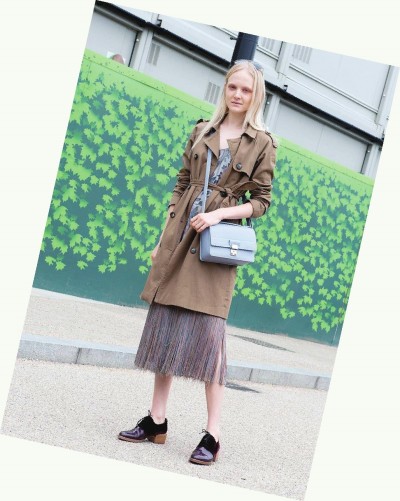 风衣搭配流苏裙,硬朗里不乏温柔。