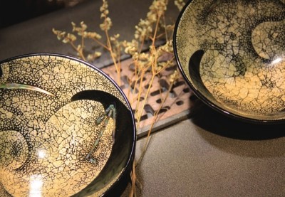 一条条金缮的线条,顺着瓷器受到冲击形成的裂纹流淌,在深色碗盏的映衬下分外抢眼。