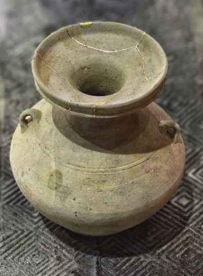 质朴的原色器皿,几笔金线的勾勒仿佛浑然天成的冰裂纹。