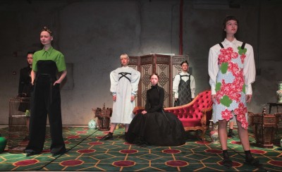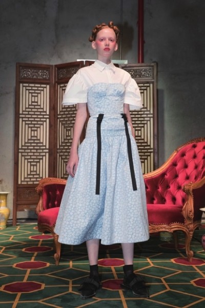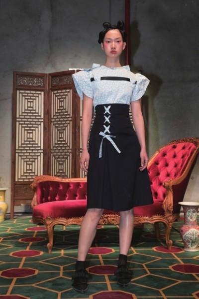 中式屏风前摆放的红色丝绒沙发,精心陈设的陶瓷花瓶,和鸟笼里鸟儿的啁啾声,共同构建出了本季SHUSHU/TONG秀场中央精致的东方客厅,也预示着这是一个充满东方审美的系列。 SHUSHU/TONG是由设计师雷留树、蒋雨彤合创的品牌,两人都毕业于伦敦时装学院女装设计研究生课程,曾在独立设计师品牌 Simone Rocha和 Gareth Pugh实习,于2015年共同创立品牌SHUSHU/TONG。 SHUSHU/TONG一向以少女的形象示人,但这种少女感又带着一些独立和反叛。这一次的主人公同样是叛逆不羁的女孩,但不同以往的是,这一季的少女多一丝性感,设计师将本季系列命名为——少女“O”的禁锢与自由。之所以这样设计,是因为这一季SHUSHU/TONG依旧从电影中汲取灵感,创意来自于寺山修司1981年创作的电影,SHUSHU/TONG想借此探讨顺从与反抗、束缚与自由的对立关系。