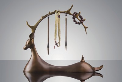 整个鹿身线条流畅简洁,鹿角的部分自然延伸弯曲,可以摆挂文房用品。其余部分,取自鹿野苑的灵感,使得整个作品设计感十足。