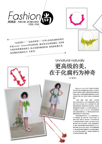 “这是首饰?!”“这也是首饰?!”许多人在看见澳洲首饰艺术家Lauren Simeoni作品的时候,都会发出这样的感叹。当首饰不再是首饰通常的样子,也正是最有趣的时刻,漂亮的皮囊太多,而有趣的灵魂却太少,不是吗? 这是Lauren Simeoni 第一次来到三W艺术展厅举行中国个展,她非常擅长在被大多数人认为是平凡的物件中发现诱人和美丽,用鲜艳色彩和丰富纹理启发灵感。诚然,大自然的动植物经常是首饰设计师们的创作题材,然而,如此“原生态”的呈现,也还是相当难得的。 “石榴”、“葡萄“、“龙眼”、“珊瑚”……如此娇艳欲滴,如此惟妙惟肖,让人忍不住要凑近脑袋,近距离地探个究竟,这才发现,在引人入胜的色彩下面,却是复杂有序的构造,这种眼见无法为实的体验,让这样的美丽显得有些光怪陆离。Lauren将自己发明的这个艺术主题称为“unnatural naturally”,意为非自然的自然物。这看似矛盾的含义,以一种新奇大胆的艺术形式展现在她的创作中,相当夺人眼球。 当被问到最初的创作时,Lauren说那还要从大约十年前说起。当时,她还不是一位设计师,而是一名金银工艺师,机缘巧合,她决定与一位艺术家好友合作,使用新型材料制作人造枝叶。他们的设计是从收集开始的。首先,他们交换来一些被人拾得的塑料材料,很快,这些日常中随处可见的材料就成为了Lauren的创作素材。她从巨大的人造叶片、枝干和花瓣收藏库中,精心选择材料做出花瓣和花环,由此制成的袋鼠爪花、金合欢花和山龙眼成为了一种潮流,进而造就了她如今的标志性颈饰形式。 渐渐地,Lauren收集创作材料的事情为越来越多的人知道,于是很多人在整理自己祖母家库存的时候、在去参加义卖会的时候,或者打算扔掉一些物品的时候,都会想起她,赠送给她一些创作素材。在Lauren看来,每一包物品都如同一份礼物,所以作为回报,她会用其中的一部分材料制成一件当代首饰,回赠给对方。 Lauren对于材料并无特别挑剔,在这些首饰中,塑料水草、蜡片、玻璃珠子、木块甚至是一些塑胶玩具剩下的部件,都成为了艺术的一份子。她毫不在意原材料的贵贱,只关注于这些材质是否能够传达出她的理念——它们看起来必须像是自然造物,但实质上又不是。于是,不知从何处拆出的木珠,明显是塑料花草上摘除的小零件,一截金属管,一条丝线……即使是量产的物件在她的手中也被变为了艺术首饰的一部分,在异想天开的美感创意下,拼接成为别具特色的夸张有趣的首饰。 这些看似自然的首饰,其实大多是由一些人造的零件拼凑出的自然的感觉,自然和不自然在不断地转换,这些新奇的首饰所带来的乐趣,不仅在于它们欢乐多彩的造型,也在于那种给人带来愉悦感的体验。人与自然之间的微妙关系也让作品带有了一丝新的深意。 平时,Lauren会花费许多时间和精力分解人造枝叶的聚合团,将每种材料按照颜色和类型进行分类。在她的工作室里,各种容器被一丝不苟地摆放得整整齐齐,这些容器里装满了人造水果、雄性花蕊、奇形怪状的叶片、大大小小的塑料花瓣。每当要制作一件首饰时,Lauren就会选取其中一两种颜色,将种种细碎的零件重新编排,直到结果令她满意为止。Lauren开玩笑地说,从工艺师到设计师,自己已然忘记如何焊接了。但不可否认,她的作品仍然会如同黄金一般珍贵。 Qa 生活周刊×Lauren Simeoni Q:你这些天马行空的灵感都是从何而来的? A:巴布亚新几内亚和非洲的传统工匠,以及保罗·克利、亚历山大·考尔德等艺术家,都为我带来灵感,所以不难发现,我近期的作品也都展现了相似的色彩、构成和材质。我在袋鼠爪颈饰里加入了铜管和弦乐的纹路,将黄色珐琅漆作为红色塑料材料的装饰细节,而山龙眼颈饰则小心地择取了石榴石的一部分……在创作过程中,如何取舍分外重要。 Q:我发现除了设计首饰以外,你还很注重首饰的搭配,是这样吗? A:是的,我对高级时装很感兴趣。这是一件顺理成章的事,因为这样就可以为我提供一个完美的背景,让我制作出一系列足以与高级时装相匹配的颈饰。我希望我设计的珠宝不只是装饰,同时还能够传递出一种喜悦和欢庆。