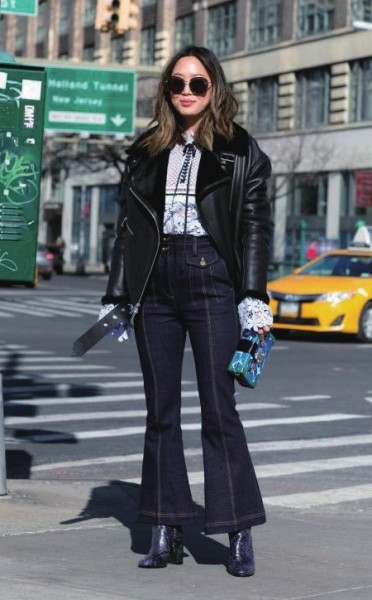 本身自带拉长腿部线条效果的喇叭裤与短靴组成最佳CP