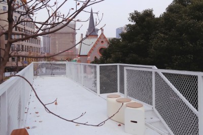 从整体看,由双层“L”型集装箱叠加互扣而成,共有三个楼层可供使用。一层箱门打开后,横排立面正对圆明园路的兰心咖啡馆,与街道连通变成一体。 竖排玻璃盒子独立成型,是天然的展品橱窗。从一层拾级而上,二楼有着长达几十米的景观走廊,是内观空间。全封闭设计让每一步都能与外滩源的绿地零距离相互观赏。露台是集装箱顶面,两个集装箱的高度放在脚下,可以远眺陆家嘴,聆听外滩整点钟声。