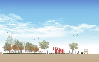 A:那就要先从“海绵城市”说起了。传统的城市雨洪都是通过地下管道的方式进行排放,但是“海绵城市”则是新一代的城市雨洪管理概念,它倡导的是在下雨时城市能够像海绵一样将雨水吸收存蓄,并通过生态自然的方式将雨水净化,最终再将这些洁净的雨水送回大自然中。在设计前期现场踏勘工作中,我们发现平南路是一条路幅较宽的硬化路面,下雨天的排水量也是相对较大的。因此我们选择平南路区域作为“海绵城市”技术的示范区域,在绿道的服务点广场设置了阶梯式的雨水花园,以完整地向社区居民演示“海绵城市”绿色生态的雨洪调蓄机制,更多地向公众普及生态环保知识。同时,我们的生态慢行系统中的漫步道以及慢跑道均采用透水铺装材料,打造“会呼吸”的城市绿道景观路面。