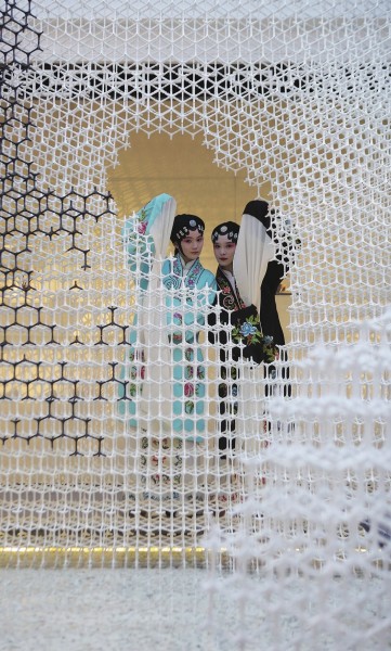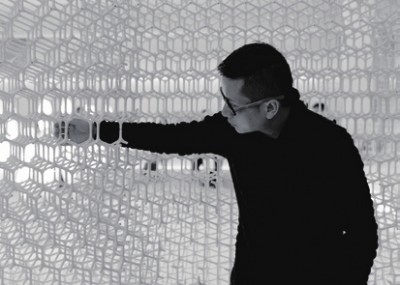 于是,杨明洁尝试用虚拟的蜂窝状Y支架系统,取代了苏州园林中的假山石与花窗。自由塑形的白色Y支架营造了交错叠嶂的假山石,同时层叠通透的效果也很好地体现了石洞与花窗所能产生的移步异景的效果。再配以黑色Y支架由密到疏的渐变穿插,增强了虚拟假山石的立体阴影。由是,“虚山水”的“虚山”部分已然完成。