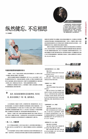 或许,我们的爱都曾经是英雄梦想,闪闪发亮;最后也都成了一饭一蔬,温热饱足。 可能是你能想到的最美的老去 一辆房车,一对恋人,飞驰在山间田野。这样的公路片和冒险无关,出人意料地,竟是一对迟暮老人携手踏上的最后一段生命历程。 《爱在记忆消逝前》里的房车不是普通的房车,名叫“leisure seeker求闲者”,见证了老夫妻俩年轻时和孩子们一起度过的无数旅程。这对爱人也不普通,阿兹海默症让约翰的记忆力越来越差,甚至会忘记妻女的名字。而妻子艾拉身患重病需要住院,约翰只能进入养老院。往前一步就是永远分开的未来,一切都让这趟旅程显得尤为特别。 逃离医院治疗,甚至隔绝子女的关心,从马萨诸塞州一路南行,目的地是两人共同的精神归宿海明威故居。就问你们酷不酷? 人设也很有意思。约翰是个老学究,文学教师和作家,海明威的死忠粉,《老人与海》是他的最爱。艾拉风韵犹存,美丽皮囊下还有有趣灵魂,接得住约翰掉的每一个书袋。记忆的间歇性消散闹出了不少笑话,惹出了不少麻烦。如走失、尿裤子、突然忘记自己在哪里等等,但约翰总能秒变顽皮“老boy”,以“斯文绅士”的口吻说出一句句饱含深情的情话。艾拉便通过幻灯机的投影,用一张张老旧的照片帮助他回忆起自己的一生。 张爱玲说:“总说爱一辈子,好像生老病死是我们掌控得了似的。何时聚,何时散,何时生,何时死,当真是不敌天命的。”无法预知如何死,但求决定怎样活。鲜少有电影表现年老的生活,年老的爱情。走过热恋和鲜活的中年,爱情最后的样子,破败不堪。 一房,二人,三餐四季 在2012年戛纳金棕榈得主、 迈克尔·哈内的《爱》中,这种诠释是冷静和残酷的。中风、偏瘫、卧床不起,当生命尊严都不在了,爱是无所谓羞耻的,是活在世上能得到的唯一甜头。 2015年柏林电影节入围作品《45周年》中的凯特和杰夫则在45周年结婚纪念日之时引爆了一场老年危机。50年前在瑞士阿尔卑斯山因意外丧生的前女友的遗体被找到了,这条消息令双方都受到了极大的震撼,却无法交流彼此深藏的不安,不论是和杰夫共进早餐还是在镇子里独自漫步,凯特都越发感觉自己像是一个陌生人。而真相令人震惊:生活里最大的绝望恐怕就是年老之时才发现自己或许不是相濡以沫的老伴生命中的唯一。45年的婚姻生活无子无女,竟是因为对前女友的挂念与歉疚。 《爱在记忆消逝前》同样有类似的危机:间歇性失忆的约翰总觉得艾拉对前男友念念不忘,而艾拉也在约翰一次失忆的呓语中偶然得知他与邻居的婚外情往事。整体风格却并不沉郁,更像是欢脱版的《爱》,淡化了不可逆的衰老、疾病带来的痛苦和无奈,以一种轻松且幽默的方式诠释了爱与陪伴的可贵。面对同样的出轨情节,也以温馨的处理方式解决。意大利导演改编美国剧本,浪漫风情加上自由核心。这是多么理想的状态:直到生命尽头,初心未变,你我心知。 心声 Mind 和有趣的桥段相比,电影的重点其实是聚焦两个老人旅行中的小细节,以及对老人内心的挖掘,让人特别感动。两位老人像孩子一样,其实都对过往心存芥蒂,这场旅行也是化解两个人心结的过程,最后观众会发现,两个人在意了一辈子的东西,在时间面前都会土崩瓦解,一生很漫长,难免走错一两步,懂得宽容和原谅,其实也是放过自己。 Movie同类项 《我亲爱的朋友们》(2016,韩国) 导演:洪忠灿 主演:高贤贞/赵寅成/金惠子/李光洙/金英玉/罗文姬/申久/尹汝贞 看点:黄昏也精彩!父母与子女,爱情与亲情,朋友与陪伴……恐惧死亡的时候,还有这些日常里金光闪闪的片刻成为支撑。 《我爱你》(2011,韩国) 导演:秋昌旼 主演:宋在浩/李顺载/尹秀晶/金秀美/宋智孝/吴达洙 看点:送牛奶的老头子金万皙邂逅了收废品的老太太宋怡芬。他们的前半生各自背负着艰辛的人生:万皙年轻时我行我素,直到妻子病逝才深觉愧疚;怡芬被心爱的男人抛弃在城市角落,孩子夭折后至老未嫁。两位老人在每天凌晨寂静的街道上相遇,孤独而苦难的生活令他们渐渐靠近。 《恋爱的温度》(2013,韩国) 导演:鲁德 主演:李民基/金敏喜/罗美兰/崔武成 看点:描写爱情最后的样子的影片还有很多。可不像《前任3》这般矫揉造作,相爱相杀,怀疑试探,场场戏都写实到令人心痛。“分手的人重新复合的概率是82%,但是复合后能走到最后的概率只有3%,剩下的97%会再次分手,和第一次分手一样的理由。” 《蓝色情人节》(2010,美国) 导演:德里克·斯安弗朗斯 主演:瑞恩·高斯林/米歇尔·威廉姆斯/费丝·瓦拉迪卡/约翰·道曼/迈克·沃格尔 看点:浪漫与物质,理想与现实,爱情与婚姻,似乎永远不能兼容。又是一部七年之痒,破碎化的片段,破碎的曾经的梦。