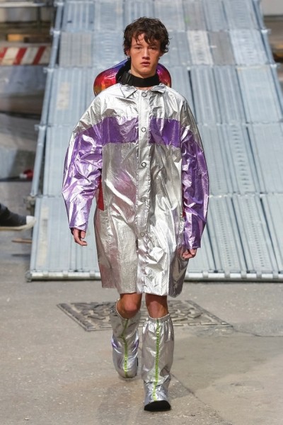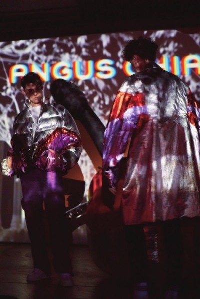ANGUS CHIANG是来自中国台湾的年轻设计师江奕勋于2015年创立的个人同名品牌。两次征战巴黎男装周,满获赞誉归来的ANGUS CHIANG 2018秋冬系列将追风自由的精神赋予服装之上,拼凑新世代追梦人的意象。记录着同样在这片土地上,为梦想打拼的人们,并重新思考对于机车的这份特殊情感和价值。在舞台(T台)上,四个模特用摇摆替代了猫步,他们犹如舞池中的领舞者,随着DJ打碟的节奏,自由摇摆着身体,沉浸在自己的音乐世界中,这让观众们也情不自禁地随之扭动起来,迅速进入这个略带梦幻的情景之中。
