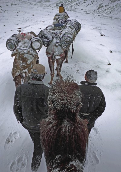 我为了这声快门等了整整二十年。对我来说,摄影中最美的瞬间往往不是某种景色,而是关乎你的理想和追求。 古时,随着“丝绸之路”的繁荣,骆驼曾是商队和旅人在西域地区非常重要的交通工具。 然而,随着交通运输行业的飞速发展,如今,我们几乎已经看不到长长的驼队背负着物资行走在绵延的沙脊上……不过,在自然条件恶劣的喀喇昆仑地区,这种原始的运输方式却成了至关重要的存在。随着喀喇昆仑地区的不断开放,海拔3500米的苦鲁勒村的骆驼养殖业及驼工向导队伍渐渐兴起。 摄影师郝沛用镜头记录下了他们的生存现状,在他看来,昆仑驼帮犹如“丝绸之路”上的活化石。 在“丝绸之路”上追逐摄影梦 郝沛成为职业摄影人至今已经有三十多年,他一直致力于拍摄新疆的自然风光、矿业资源及民俗文化。在此之前,他曾经只是一名普通的美术老师,怀着好奇心买了第一台海鸥相机,开启了摄影的大门。起初,对摄影一窍不通的郝沛把当时工资的三分之一都用来购买摄影杂志,自行揣摩、练习。有一次,郝沛突发奇想,用剪影的效果拍摄了两位地质工作者在夕阳下工作归来的照片,送到县里参加摄影展览,结果还被奖励了15块钱,他由此对摄影产生强烈的兴趣和热情。 直到1983年,郝沛因为摄影能力出众被调入刚筹建不久的新疆地质矿产陈列馆(现名为新疆地质矿产博物馆)负责图片的征集和拍摄工作。 郝沛才从一名业余摄影爱好者迈入了专业领域。当时,他被派去寻找两张代表新疆名片的图片,一张是世界第二高峰的乔戈里峰,另一张是克勒青河上游的山岳冰川景观。郝沛找了两个多月,从新疆一路找到了北京都没能找到,这让他开始了反思,新疆有太多绮丽的风景却无人记录,实在可惜。而自己作为一名新疆的地貌摄影师,却没有拍过这两处景观,必将留下终身遗憾。 为了实现自己的摄影理想,郝沛毅然辞去了原本安逸的工作,正式走上职业摄影师的道路。郝沛决定主攻新疆典型的极限地区地质地貌景观,他希望把那些尚未被世人了解的壮美景色通过自己的镜头呈现出来,并一直坚持到了现在。 喀喇昆仑山脉是世界上最高大的山系之一,拥有4座8000米级高峰。喀喇昆仑主峰——乔戈里峰,意为“山地之王”,海拔8611米。喀喇昆仑腹地海拔相对较高,恶劣的气候环境和艰苦的交通条件,使众多摄影人望而却步。因此,为了实现自己的梦想,郝沛足足等了十多年,他才做好了充分准备,向喀喇昆仑发起挑战。 在进入喀喇昆仑前,郝沛相继拜访登山家、探险家和地理、水文专家,请教在高海拔地区生存要面临哪些意想不到的困难及应对方法。此外,为了适应喀喇昆仑腹地恶劣的气候环境,在正式进入喀喇昆仑之前,郝沛还先后在天山托木尔峰脚下的琼台兰冰川、且末塔克里克苏玉石矿、东昆仑黄羊岭、云雾岭等海拔均高于4400米的地区一边拍摄,一边学习和演练在极限条件下解决饮食住行的问题。同时,也对自己的身体条件进行测试和科学评估。 冒着危险等待生机 从2008年开始,郝沛在五年内四入喀喇昆仑。可以说,每一次都要冒着生命危险,所幸,有驼队和驼工师傅的保驾护航,才让一切有惊无险。 每次进入喀喇昆仑腹地拍摄,郝沛都要在距离乔戈里峰最近的苦鲁勒村租上骆驼并聘请驼工向导。据郝沛介绍,苦鲁勒村地处喀喇昆仑山脉深处,是离县城最远的柯尔克孜族村落。当时,村子里只有38户人家,共138人,全部是柯尔克孜族。村民居住的房屋是用石头和黄泥粘结垒起的。村里几乎没有农作物,仅存着的几棵柳树彰显高原村落奇特的生机。村民主要以畜牧业收入作为经济来源。近几年,随着乔戈里峰地区的不断开放,驼队运输及驼工向导又萌发出了新的生机。 郝沛非常信赖这里的柯尔克孜族驼工师傅,因为他们不仅协助过许多世界著名的登山队、探险家,更重要的是他们对高原环境有着丰富的经验。他们能用特殊的口哨指挥骆驼,用熟练的技能在骆驼身上捆绑物资,从选择行走路线、观察气象到过河的最佳位置,无不彰显着他们的聪明睿智。哪里有几条河、哪里是峡谷、哪里有清澈的水源、哪里适合扎营,他们都轻车熟路。 在听取了新疆水利厅专家的建议后,郝沛将首次进入喀喇昆仑山脉的时间定在了四月中旬,为了避开克勒青河上游的突发性洪水。但这依旧不可避免地成为了郝沛最难忘、最艰辛的一次摄影历程。 5个人、12峰骆驼、3头毛驴、2条猎狗,这样一支浩浩荡荡的队伍正式踏上了旅程。郝沛回忆,驼队刚离开村子行走不到三个小时,就要沿着河谷一侧的盘山道走进河床,河床里布满了鹅卵石,骆驼只能在石头缝隙中寻找落脚处。接下来,又要攀爬“一线天”路程中最险要的一段。驼工们吹着只有骆驼才能听懂的口哨,护送驼队走过这段修建在崖壁上的“天路”,一侧是陡峭岩壁,另一侧则是万丈深渊。驼工师傅告诉郝沛,短短几年中,已有六峰骆驼在这段路程中坠入峡谷。“我这个人是从来没有恐高症的,可当时站在那里,环顾左右,险象环生,感觉自己头发晕,天旋地转。”幸运的是,整个驼队顺利通过。 虽然惊险万分,但郝沛也在途中发现了暖心的画面。好几峰骆驼经过时,都会在驼工师傅身边停一下,然后点点头,看上去就像在感谢师傅们的护送,驼工们也会拍拍骆驼,再吹一声口哨,骆驼又挪动着脚步向前走去。看到这一幕,他情不自禁地流下了眼泪,也只有在这样