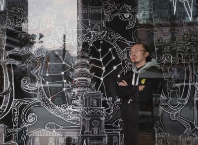 朱敬一在2017“艺述·百年徐家汇”设计的水墨剪纸橱窗