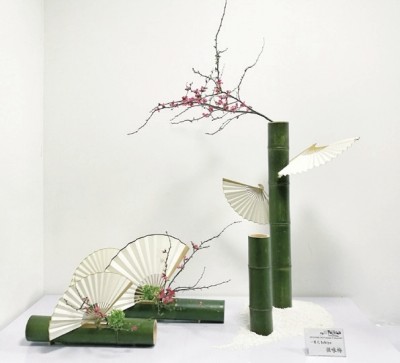 作品来自家元,一叶式生花创造性地使用竹子。