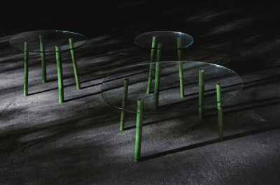 “竹林系列”一共包括八件家具和照明产品——三个咖啡桌、一个矩形餐桌、一个圆桌餐桌、一个搁架系统和两套吊灯。竹竿和透明玻璃的组合在碎片中产生了一些空隙,而放置在桌子或搁板上的物体似乎就浮在这个空隙上。