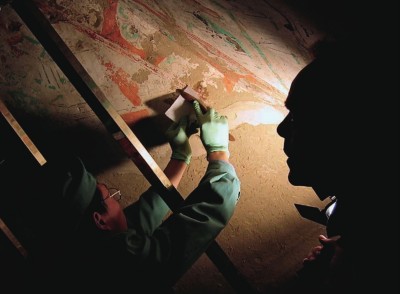 在敦煌莫高窟第85窟的壁画修复现场,敦煌研究院的唐伟和美国盖蒂保护研究所的史蒂文正在修复壁画