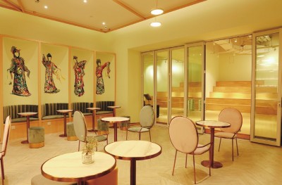 这里绝不是你想象中那种幽静的传统茶室,相反,这里有一片属于年轻人的舞台。吧台敞亮,白色、金属色的搭配,极具现代感;精致的玻璃器皿,亦古亦今。座位都是少女们最爱的马卡龙色,连墙壁都是超粉嫩的薄荷绿。生旦净丑四个抽象化的戏曲形象,被画师绘在墙上,不失传统韵味,又极富现代质感。舞台四四方方,配有整面墙大的落地镜,平日可作授课、演出使用。