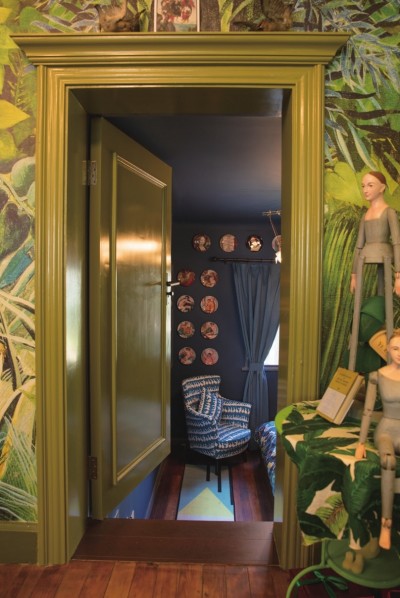 毫不夸张地说,步入叶子乐的新居,犹如进入了博物馆奇妙夜或者是爱丽丝梦游仙境——整套房子被各种绿植所覆盖,沙发后面更是一整墙惟妙惟肖的森林背景,而在用原木打造的展示柜上,叶子乐从世界各地带回来的纪念品,更是让人目不暇接,每一件都有自己背后的故事,有的是从跳蚤市场淘来的古董,有的是从街边小店觅来的孤品,甚至有的只是路上信手捡到的蘑菇、石头……这些物件串联起叶子乐的快乐记忆,承载着他丰富的内心情感。