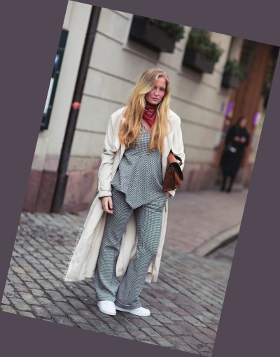 色彩跳跃的小方巾为素雅的衣着增添了亮点