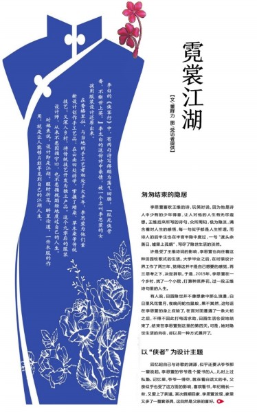 每个人的内心,都有对归隐生活的向往。但迫于诸多原因,无法实现,希望这件衣服,能真正反映穿着者内心想要的生活。短暂的一刻,实现小小的愿望。 李白的《侠客行》中,有两句诗写得颇为荡气回肠:“纵死侠骨香,不惭世上英。”李太白的这份诗中豪情,被一个名叫李思萱的女孩用服装设计还原出来。 在香格里拉,与当地的手工艺者相处了大半年,李思萱为他们重新设计创作手工艺品;在云南四处游学,掌握了蜡染、草木染等传统技艺;又深入乡村,将传统技艺开发为独立产品。这个九零后的服装设计师,从来不愿因循守旧,也不愿循规蹈矩地度过自己的人生。 对她来说,设计即是江湖。醒时折花,醉里论道,一件衣服的作用,就是让人能够片刻寻觅到自己的江湖人生。 匆匆结束的隐居 李思萱喜欢王维的诗,玩笑时说,因为他是诗人中少有的少年得意,让人对他的人生有无尽遐想。王维后来所写的诗句,众所周知,极为隐淡,满含着对人生的感悟,每一句似乎都是人生哲理。而诗人的后半生也在半官半隐中度过,一句“渡头余落日,墟里上孤烟”,写尽了隐世生活的淡然。 许是受了王维诗词的影响,李思萱也向往着这种田园牧歌式的生活。大学毕业之后,在时装设计界工作了两三年,觉得这并不是自己想要的感觉,再三思考之下,决定辞职。于是,2015年,李思萱在一个乡村,找了一个小院,打算种菜养花,过一段王维诗句里的人生。 有人说,田园隐世并不像想象中那么浪漫,白日里风花雪月,夜晚间蛇虫鼠蚁,果不其然,这句话在李思萱的身上应验了。在面对面遭遇了一条大蛇之后,不得不因此打电话求助,田园生活仓促地结束了,结束在李思萱到这里的第四天。可是,她对隐世生活的向往,却以另一种方式展开了。 以“侠者”为设计主题 回忆起自己与诗歌的渊源,似乎还要从爷爷那一辈说起。李思萱的爷爷是个爱书的人,儿时上过私塾。记忆里,爷爷一得空,就在看白话文的书。父亲似乎也受了这方面的影响,喜欢看书,年纪稍长一些,又爱上了茶道。某次假期回家,李思萱发现,家里又多了一整套茶具,这自然是父亲的喜好。 父亲是上世纪八十年代的大学生,书柜里藏着《三侠五义》,还有金庸、古龙的小说。但凡是书柜里有的书,李思萱每片纸都要读一下,不让读,就躲在被子里,打着手电,偷偷地看。最喜欢的人物是“小东邪”郭襄,因为她的“骄傲”,虽有遗憾,但不曾有后悔。印象最深的是,金庸借郭靖之口,说的那句“侠之大者,为国为民”,后来,她有了自己的解读:“即便不是为国为民,至少通过自己的能力去做一些事情,不图功名利禄,自己的内心也会获得满足。”而“侠者”也成为她设计服装的一个主题。 李思萱说,把诗歌具象为服装设计,其实没有想象中那么神秘。诗歌意境缥缈,用服装来表现,难免要抓取其中具有代表性的元素,比如提取配色和感觉,这就依赖设计师平日的积累。李思萱自己就很喜欢收集传统诗歌中的“颜色”,并为其设计搭配合适的廓形和材质。比如,李白的诗情豪放,适合青、白的色彩,廓形大、材质仙,希望通过这样的服饰设计,让穿着这件衣服的人,能够放下生活中繁杂的事情:“每个人的内心,都有对归隐生活的向往。但迫于诸多原因,无法实现,希望这件衣服,能真正反映穿着者内心想要的生活。短暂的一刻,实现小小的愿望。” 文化赋予手工艺品的意义 虽说是以诗词等中式元素,作为设计的灵感来源。但对于李思萱来说,纯粹的传统并不是她想要的东西,相反,她希望这些设计能够适合日常穿着。这也是她在香格里拉做志愿者时,主要的工作之一。 詹姆斯·希尔顿的《消失的地平线》里,有一段这样的描述:“他一直凝视着窗外的景色,暮色已经降临,厚重的,天鹅绒般柔软的夜幕浸染着一切,如同墨色一般向上弥漫开来。这时,整座山脉越来越近了,渐渐地淹没在这苍茫的暮色中。一轮满月缓缓升起,仿佛挂在天空中的一盏明灯,用柔和的光芒抚着每一座山峦,直到遥远天边长长的地平线,在蓝黑的天幕下闪动着点点光辉。”这地平线消失的地方名为“香格里拉”,后来有一处叫“迪庆”的地方,正与这书中的世外桃源相合,从此这里便成为了现实中的“香格里拉”。 李思萱跟随着一个手工艺品中心到了这里,与当地的手工艺人为邻,日常的工作是教授汉语和手工技艺,时不时也与当地的手工职人一同手作,或是闲来聊天:“传统的工艺其实相当耗费时间和精力,但是因为一定程度和当代的审美脱节,所以放到店里,不一定好卖。需要经过重新设计,以帮助当地的人们,增加一点收入。” 重新设计手工艺品的重点在于,把握传统元素和时尚元素的“度”。比如,仍然会保留当地特有的纺织品,或是当地特有的色彩元素,不需要太多,刚刚好,才能适合当代的审美和生活习惯。 侠者,在衣,亦在心 在香格里拉待了大半年的时间,李思萱重新启程,在云南地区四处游学。到了大理,学了扎染;到苗族的聚居地,又学了蜡染。转了一大圈,最后到了一个叫沙溪古镇的地方,有人说,它是十年前的丽江,村里人过着自己不被打扰的小日子,却正因为保留着古朴的生活习惯,而吸引着人们不断去探索。 每个周五的早晨,都是当地雷打不动的传统集市日。在村子中心的大街两边,村民们自发摆摊,卖着各种稀奇古怪的“产品”,有些是自家种的农产品,有些是从山上采的,有时遇见上了年纪的婆婆,叫卖自