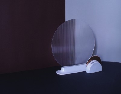 “幻”是一组以陶瓷为主要材质的创意摆件,两个部件分别具备了“屏风”和“花器”的功能。作为主体的“屏风”部分是将亚克力板材与陶瓷底座相结合,圆润的外形具有东方审美的神韵。作为“花器”的部分以传统方式成瓷后加以金色的贴花,贴花呈圆弧形,与花器的本体形状相辅相成。