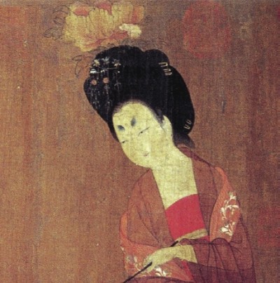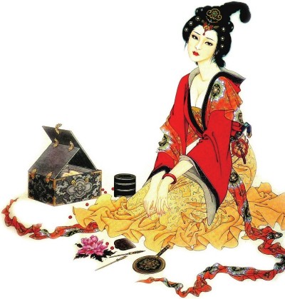 •隋唐:在面妆方面,浓艳的红妆成了面妆的主流,如此的大胆与对红色的偏爱,在其他朝代是绝无仅有的。在眉妆上,则开辟了中国历史上眉式造型最为丰富的时期。各种长眉、 短眉、蛾眉、阔眉交替流行,并且还出现了许多十分另类的短阔眉式。仅玄宗时就曾命人画过《十眉图》,可见唐代眉式之丰富。在唇妆方面,则在晚唐僖昭年间达到顶峰。各种唇式名目达一二十种之多,且色彩十分丰富,造型上,则仍以小巧圆润为美。在面饰方面,各种各样的面饰已进入了寻常百姓之家。