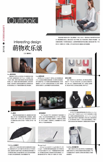 在越来越忙碌的生活中,我们需要多一些让人会心一笑的身边小物来调节自己的状态,帮助冥想的坐垫让人静坐沉思、专注于呼吸;设计巧妙的哑铃,兼顾艺术和健康……这些美好的萌物,不但有科技的成分,让使用者有更多的空间去想象。愉快地记录下每一件小事,每一次留言,每一次灵感。工作之余任性生活,随意放大自己的脑洞。 Story悬浮时钟 瑞典的设计公司Flyte以抗拒地心引力的悬浮设计而闻名于产品界,这款悬浮时钟,叫作“Story”。外型简约,只有一块高42.5毫米、直径268毫米的胡桃木或白蜡木制成的圆形钟面,以及一粒直径16毫米的悬浮金属球体。没有任何时间刻度,也没有指针,但悬浮的金属球体会以运转的形式来标记时间的轨迹,令人不禁联想到围绕太阳公转的星球。 Undo冥想坐垫 设计师Jordon Diatlo设计了一款符合人体工学的冥想坐垫Undo,让你的身体调整到正确的姿势,可以维持长时间的静坐而不会感到不适。Undo内部是由多层的海绵橡胶构成,外型呈现圆弧状,当人坐下时,坐垫就会轻轻地将人向上带动,将臀部自然地与背部对齐,让身体调整到不会受到负担的姿势。 音乐U形枕 这是一款名为Ototone的U形枕头,设计师在枕头两侧分别设计了一个可以放入耳机的口袋,让办公族可以听着音乐在桌上小憩一会儿,还能保持耳朵温暖,并在一定程度上保持隔音。轻松的午休时光,音乐和枕头的搭配,再好不过了。 Plat哑铃 哑铃这种运动器械可能很少有人直接摆放在客厅的显眼处。而Plat是一款优雅精致的哑铃,低调的配色,细致的刻度线,好像一个艺术品。此外,它的底座还是一块电子时钟,直接放在桌上你会认为它是一个装饰品,而不是一个健身器材! 旋转玻璃灯 Raw Edges设计了尺寸、色彩各异的30个旋转玻璃灯,它们是以一种以色列的传统舞蹈为灵感,30个灯会一直慢慢旋转,所以这是一个动态装置。灯具的每一个玻璃片看上去都像是一片叶子,连接到一个旋转电机上。光源隐藏在中央,会在玻璃叶片上产生渐变照明的效果。 24小时极简腕表 专门生产手工制造家居用品的意大利公司sabri na fossi design,推出了一款名为freakish WATCH的特别款24小时腕表。为展现出这款腕表独特的风格,sabrina fossi design特地精心选择了原材料:既要质量轻,纤薄、舒适,还要坚固且防水。设计师先将多个配件一一对准,固定在铝制表盘上,再装入直径36厘米的纤薄不锈钢表壳中,搭配真皮表带和平面表镜。 TARAbrella智能伞 这把TARAbrella最大的特点是所有功能都由雨伞本身实现,没有附加手机APP。其中内置气压计每35秒对大气气压进行检测,湿度表用于检测空气湿度,微处理器则综合两者数据,对天气情况进行预测。用户通过观察伞把上的LED灯来获取预测的天气信息。显示由透明到深蓝,分别代表晴朗到下雨。 Message board Message board出自ORO living设计团队之手。ORO living是一个北欧简约情怀家居用品品牌,致力于把现代设计与生活文化融合升华。它由一个陶瓷圆盘座和两支记号笔及一块可擦拭灰色布组成,简洁的设计和任性涂鸦结合,让人随时愉快地记录下每一件备忘,每一次留言,每一次灵感。 FoldiMate自动叠衣机 美国一家名叫FoldiMate的公司开发出了这款能够批量自动叠好衣物的产品。衣物经过高温蒸汽熨烫后自动叠好,不仅干净柔顺而且还有一定的香味,使用者全程只要通过LED触控屏控制即可。