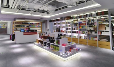 书店中随处可见的书柜展架及中岛的设计,不同于现有书店的常规布置和陈列。运用不规则的高低陈列和方块造型,进行错综交织的排列。在满足功能和数量布置的同时,创造了最大的视觉冲击。中岛区的凹陷设计,搭配明亮的灯光,除了能突显主打商品之外,更有藏匿式抽屉,简约简单,增加了该区域的收纳功能。