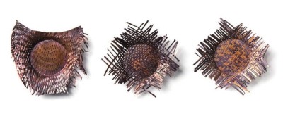 这是一系列铜片编织而成的碗具,周围参差不齐的铜片是手工的痕迹。这系列碗具能够用来摆放食物,在人们日常生活中也能派上用场。