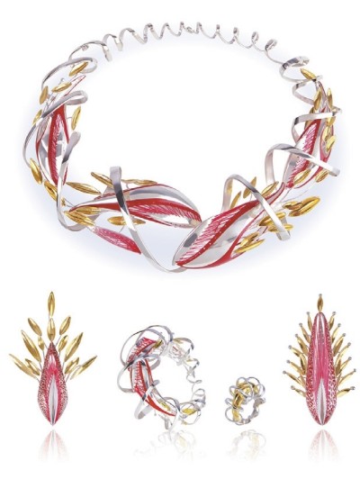 来源于海洋中轻盈飘逸的水母,以装置设计的结构和鲜明的红、金色为主的色调,来传达设计者对“空间”、“视觉”与“体验”在当代首饰上的设计理解。