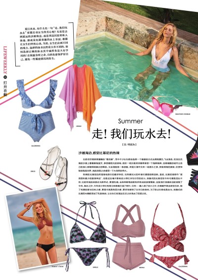 当然,这也并不代表女生们一定要穿上一件“欧巴桑”的泳衣。首先,可以选择一些鲜明而又大胆的颜色,今年大热的极光紫、冰淇淋蓝、樱花粉、柠檬黄都是不错的选择。然后,可以选择那些具有“假细节”的传统泳衣,诸如不会影响松紧的系带,两侧拼贴的荷叶边、蝴蝶结,点缀用的塑料圆环……让你在尽情玩乐之余免去了后顾之忧。