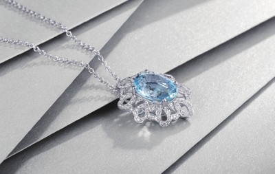 用像海水一样清澈的海蓝宝为主石,给人以优雅、冷艳、高贵的感觉。以钻石和白金镶嵌出类似雪花的图案,更加清新灵动。