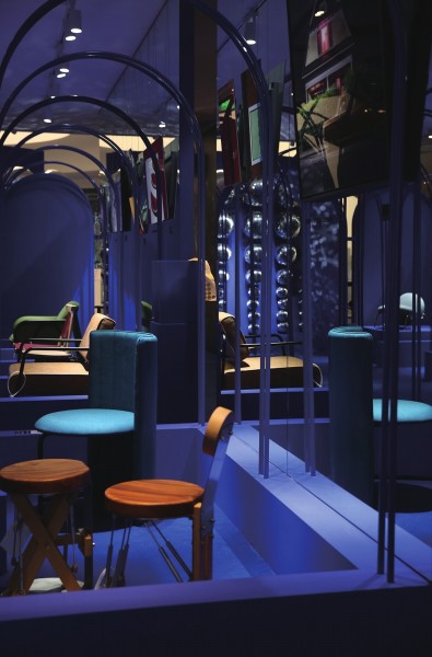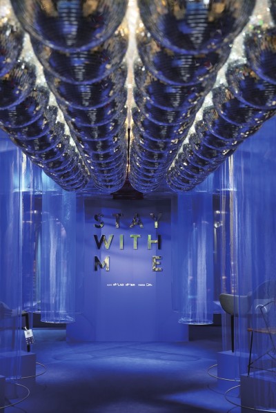 就这样,我们总是把椅凳当成器物,或者工具。试想如果椅凳会说话,它们会以何种心态来面对我们,又会说些什么?或许,它们把我们看作自己的唯一,因为它们的生活里只有我们。或许,它们会用微弱的声音,一遍遍深情低叹深藏心底的话:stay with me。“当这些画面浮现在我脑海的时候,我意识到没有哪种颜色,比这种饱和度最高的蓝色,更适合表达这种浓郁、诚挚,还有一点点忧伤的感情。”回忆至此,展陈设计师梁海涛依旧动情。而场内的标志物迪斯科球,则被他理解为光芒。“那是家中宠物看见我们推门而入那一刻的幸福感,是椅子见到我们时眼里的光芒。”