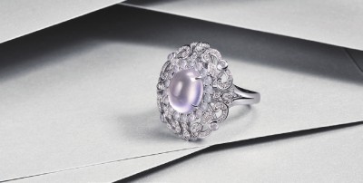 通透的冰种翡翠作为主石,在钻石与白金戒托的衬托下,冰种翡翠晶莹剔透,既优雅又浪漫,散发出摄人心魄的魅力。