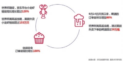 它是足球界当之无愧的第一盛宴,32支球队在这个夏季奉献了最杰出的表演。看似体育盛事,实则经济大事的世界杯在球迷中拉动起来的消费趋势,又是怎么样的呢?京东与美团融合线上线下数据,最新联合发布了《京东&美团世界杯消费报告》,让我们一起来揭秘本届世界杯的消费趋势,读懂这届球迷的观赛众生相。 京东大数据显示,世界杯开赛前,京东球迷囤货购买的啤酒中,进口啤酒销量占比超三成,高于非球迷用户进口啤酒销量的占比。而进口啤酒中又以墨西哥啤酒销量增长最快,相比德国、葡萄牙、比利时的进口啤酒,墨西哥啤酒比墨西哥队的热度更高。 作为“盛夏标配”,在世界杯期间,京东平台小龙虾的销量同比增长超过了120%,相比往年更受欢迎。自6月14日开赛以来,一向受欢迎的啤酒订单量环比也增加了60%,休闲零食的订单量同比增长达到100%。世界杯开幕战当晚,美团外卖小龙虾销量就超过153万只,啤酒销量则超过28万瓶。 世界杯比赛时段内,在深夜观球胃口大比拼中,男性贡献了56%的外卖订单,按照比例分析,在吃货属性上女性球迷惜败;其中八零后和九零后的男性稳稳占据外卖订单量先锋,占比高达90%。而在世界杯的南北“外卖大战”中,南方地区取得了压倒性胜利。世界杯期间,南方用户外卖订单高出北方38%,东部地区用户外卖订单占比近六成,二线城市用户贡献了近四成外卖订单。 看球的气氛激活了球迷们亲自下场的洪荒之力,球迷们用“买买买”为自己喜爱的球队和球星打call。美团数据显示,梅西、内马尔等超级球星比赛的场次,夜间外卖较平日上涨17%,法国队的姆巴佩、比利时队的卢卡库、英格兰队的凯恩出场时,外卖订单都有所上涨。值得一提的是,新晋超级球星虽然层出不穷,但是带货能力最强的还要属梅西和C罗。