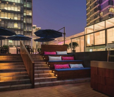 窝在柔软的沙发上,俯瞰魔都,每到天气晴朗的黄昏,由粉转橘的夕阳尽收眼底。你可以和好友们围坐在按摩浴缸边,把双脚伸进池内,恍惚间,仿佛置身河边嬉戏般清凉畅快。伴随着现场DJ的旋律,享受片刻闲暇。