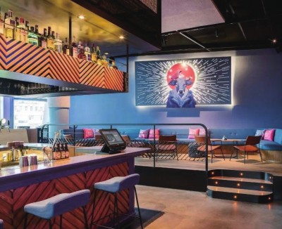 室内酒吧与露台连接,方便宾客游走于两处空间。吧台壁墙化身为充满艺术性的画布,展示了体现迈阿密风情的画作。比如,受到迈阿密街头涂鸦艺术的启发,一幅勾勒迈阿密人们悠闲快乐生活方式的现代涂鸦创作就被点缀在东面的旗墙上。