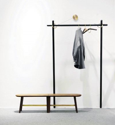 这个衣帽架应用最简单的结构来实现:墙上只有一个装饰感极强的固定点,横竖木棒呈十字交接,由黄铜圆环连接。当你不需要使用它的时候,可以将它彻底收纳起来,只留下墙面的黄铜挂件,或者将它直接悬挂在墙面的黄铜挂件上。