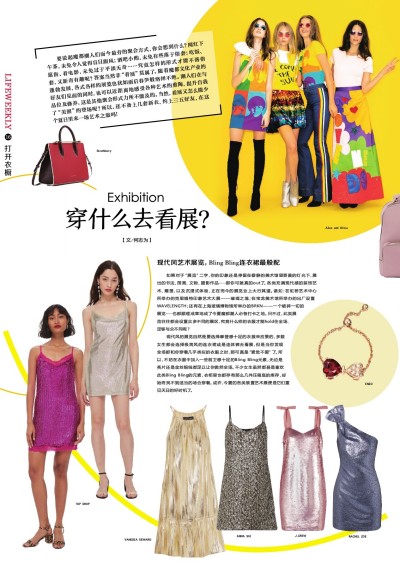 现代风的展览自然是要选择摩登感十足的衣服来应景的,多数女生都会选择极简风的连衣裙或是连体裤去看展,但是当你发现全场都和你穿着几乎类似的衣服之时,那可真是“累觉不爱”了。所以,不妨在衣服中加入一些前卫感十足的Bling Bling元素,无论是亮片还是金丝银线都足以让你傲然全场。不少女生虽然都甚是喜欢此类Bling Bling的元素,衣柜里也都存有那么几件压箱底的库存,却始终找不到适当的场合穿着。或许,今夏的各类装置艺术展便是它们重见天日的好时机了。