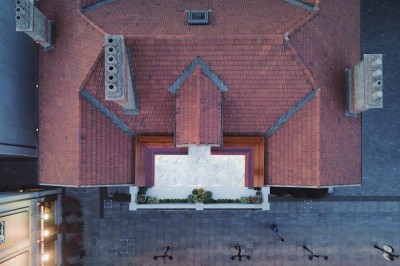 穿过街楼,进入酒店的主院落。花园从外看来是一片静谧的绿荫葱葱,透过绿荫隐约可看到柳条编织的座椅和汩汩喷涌的泉水。建业里最为特色的地标建筑物是“水塔”,曾是当地居民取水的地方。主院落内的水塔现已是酒店的最高建筑物,被用作照明与信号服务设施。现在,水塔不仅被保留下来,更得到了重新设计,成为了酒店内点睛的一笔,人们还可以登上塔顶纵览建业里的美景。
