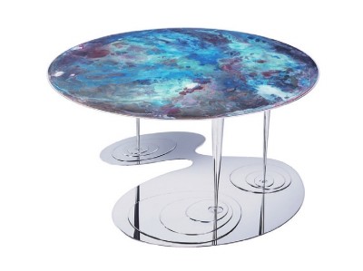 桌面色彩源于“星尘”带来的灵感:五彩斑斓的金属矿物元素互相交融,彼此滋养,形成奇幻的星尘世界。运用“引火入水”的铜着色技法将色彩“绘”于桌面,深邃、广袤、富有生命气息。色彩源于“星尘”,融化于地球之“水”:桌脚以水波造型予以呈现,荡漾开来,是生命独有的形态。