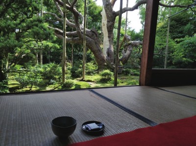 走出三千院,不远便是宝泉院。玄关附近的树龄近700年的五叶松,盘根错节,虬曲苍劲。盘桓园中的“额缘庭园”,木柱之间透出的庭园风景仿若镶嵌在画框之中的画卷,晨昏雨雪,四季变换,草木枯荣,隽永精致。在这里,感受不到夏天的丝毫燥热。书院中竹林摇曳,清风拂面,竹海中回绕着竹香,牵引着融入这片竹林的绿韵中。