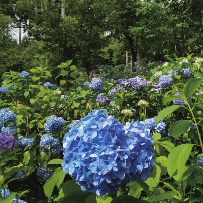 三千院寺内佛像均为日本国家级重要文化财产,境内溪流环绕,青苔遍地,每逢梅雨季节,紫阳花盛放,花簇繁茂蓬勃,清幽雅朴。其庭院不同于一般印象中日本庭院“枯山水”的风格,寺内北侧的琉璃光庭,各样植物花草,参天古杉,绮草芊芊,岚峰伍伍,安静雅致。