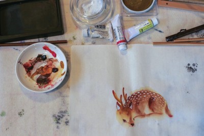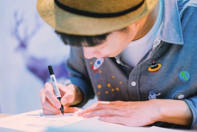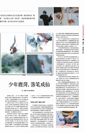 不论是自己的绘本还是文创品牌,鹿菏都冠以“隐世之国”,这是他心中的“乌托邦”,他的理想是避开都市喧嚣和浮躁,去往有山有水之处隐居。 都说,会画画的人拥有一个有趣的灵魂。从平凡世界到画中乌托邦,“灵魂”画手们,“笔”下生花,用不同形态的画代替语言的表达。有趣的是,他们都找到了电影、电视剧,这类能引起共鸣的便利途径,找到了情感的寄托,直指人心。如少年鹿菏与他的隐世之国,如茗喆与她的沙画爱丽丝仙境……画,是他们对抗孤独的力量,帮助他们保持赤子之心,像少年一样随心随意地自由生活。热爱一件事,不问结果,不辞辛苦,时间会尊重你的坚持和付出。 用中国画颜料中的花青和石绿配以淡墨点染成碧波荡漾的池水,身形酷似墨色锦鲤的人鱼与身穿暗红衣裙的爱丽莎正手挽手向更深、 更神秘的池水深处游去……这是年初,奥斯卡最佳影片《水形物语》发布的一张中国风海报。 这幅画看似寡淡,却又透露出一股隐隐的力量,用一种东方视角重新解读了这部影片,不仅在国内赢得赞誉一片,导演吉尔莫·德尔·托罗也对其喜爱有加,将其发布在个人的社交网络上,引起了全世界的瞩目。而更引发人好奇心的,是这幅画背后的原作者鹿菏。他的画总是灵动若仙,且人如其画,外表看似柔弱,却有坚定的心。 钻进古籍里画神怪 在此之前,其实鹿菏在圈内就颇有名气,曾为许多杂志绘制封面与插图,连载小说《浮生物语》里面的插画也是由他所作。鹿菏从小喜欢画画,只是和同龄人不太一样,他偏爱中国风。小时候因为家庭条件一般,即便喜欢画画也没有特别去报班学习。平时,小鹿菏会拿出家里的那些国画画册,自己用毛笔仿照着“涂鸦”。他也和很多从小喜欢画画的孩子们一样,把书本的角落填得满满当当,没留下一本“干净的”书。 见过鹿菏的人,都惊叹他的少年感十足,总是一副温润柔和的大男孩形象。被认作是典型的“明明可以靠颜值,却偏偏要靠才艺”。 大学时,鹿菏选择了中文系,因为他对古汉语特别感兴趣,其间也看了很多古书古籍,尤其是志怪小说。毕业时,曾想过去出版社当编辑,结果投了文稿还特意配了自己画的图,结果编辑一句“你还是去画画吧”给他泼了一头冷水。于是对文字工作断了念想,安安静静地回到自己的绘画世界里。习惯了SOHO的他,干脆自己在家创作,专心打理自己的工作室。 因为非科班出身,鹿菏一直在不断摸索和尝试适合自己的风格。2010年刚入行的时候,他尝试过很多,比如用手绘板模仿手绘质感的画,后来才反应过来,“为什么要辛辛苦苦模仿手绘风格,我直接手绘不就好了”。他说,自己不会排斥使用新技术,故步自封。相反,现在市面上的绘图软件他几乎都会用,此外,还会自己制作视频。 鹿菏画仙,也画人,一花一草一木都能入画,但最喜欢画妖。他的画,总透着浓浓的中国风,之所以给自己起名“鹿菏”,也是取自他喜爱的“鹿”与”鹤”的谐音。鹿菏笔下的妖总是带着股灵动之气,他特别为妖创作了一个“山海有灵”的系列,天马行空、 影影绰绰,总叫人看不真切。这些灵感,鹿菏通常都是从《聊斋志异》《搜神记》《山海经》《太平广记》《拾遗录》等古籍中取材,他形容这些古籍“犹如宝库,取之不尽”。书里的文字总是给他带来无限的遐想,他在阅读的过程中,就选择令自己有所触动的形象,一点点描摹出它们的样子来。 鹿菏在创作时,特别专注,不跟别人交流,只是默默闭关。但从不把自己“关”在同一个地方,或许是想保持“一直在路上”的状态,让灵感得到不断的滋养,每隔一年半载,他就会打开地图,寻找新的城市新的住所。这些年,他不知不觉一路从雅安、广州、日照、杭州、 成都、大理,到了如今的歇脚地重庆。但今年或许鹿菏要打破惯例,为了实现自己的“美院梦”,今年他已重返校园,正在四川美院进修视觉艺术传达专业,为了方便上学,可能暂时先不搬家了。或许是一个人住久了,现在的鹿菏特别享受上学的日子:“感觉特别好,可以和同学相互交流,开拓思路。” 寻找心中的“隐世之国” 因为要兼顾工作室和学生的身份,如今的鹿菏格外忙碌,除了忙着完成课业,忙着粉丝期盼着的团扇周边,还在忙和法国作家的合作绘本。鹿菏说,现在越来越多的外国合作资源会找到自己,这都要拜《水形物语》所赐。 早前,鹿菏在美国旅行时,恰巧已经看过《水形物语》,所以当片方找到他合作海报的时候,他除了惊喜,也觉得有缘。片方给了他大致的故事梗概,没有做过多的限制,只是需要鹿菏创作出一幅东方感觉的海报。首次跟电影合作,就遇上了奥斯卡最佳影片这样的“大咖”,着实让鹿菏倍感压力:“从来没有和电影合作过,也不知道怎么比较合适,所以初期的时候非常焦虑,一直狂掉头发。”在一个月的创作期内,前半个月他非常迷茫,不断尝试各种绘制方法,比如中国画中比较少见的技法:水拓法、吸墨法,以及撞色法等等,试图用墨色的延展性来创造新的肌理质感。经过不断的尝试,鹿菏发现用水拓法来画池塘会比较合适,才找到了创作方向。 后半个月,鹿菏的脑子里有了比较清晰的创作概念,接下来的绘制就简单许多。从草图到最终的成稿,鹿菏大概提交了好几十版,才有了大家现在看到的海报。即便最终定稿之后,鹿菏的心里仍旧忐忑,直到导演在社交网络上晒出了自己的图,还大加赞赏,才让鹿菏松了一口气