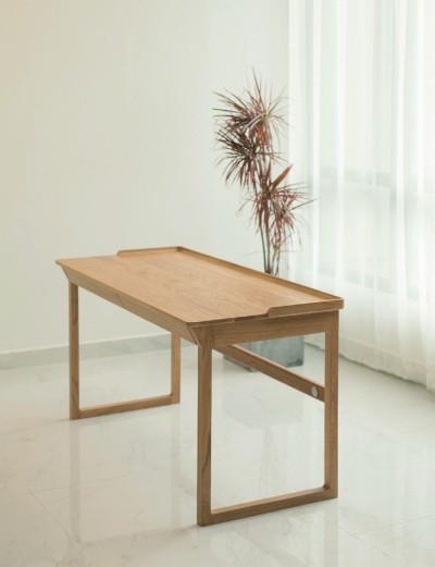 整体采用中正的架构设计,符合东方的平衡美感。半包围式的桌面,防止细小物件的滚落;倾斜的抽屉面板,可避免使用过程中的磕碰; 抽屉采用实木滑轨,安全而顺滑。耐得起推敲的细节彰显外方内圆的设计哲学,造就一张温润、安静的书桌。