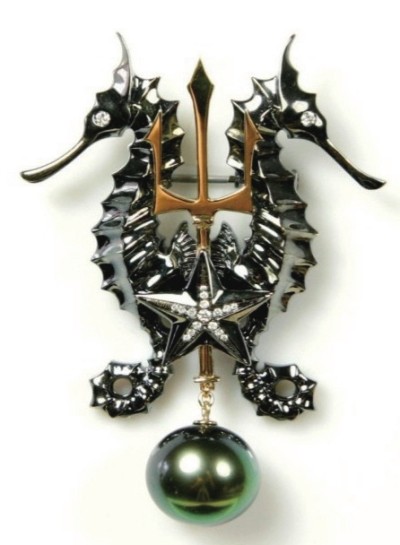 作品的设计灵感源于对希腊神话和亚特兰蒂斯文明的幻想。海神波塞冬金色的三叉戟是他执掌七大洋的法器,而在传说中海马是他忠实的传令兵。作品中两匹海马相背而立,头部略低垂安详,与海星一起守护着海神尊贵的武器,意在表达此时的波塞冬不必手持利器出海巡视,故起名为“安睡的波塞冬”。作品曾刊登于伦敦版《VOGUE》杂志,也引导设计师在首饰中增添时尚元素。