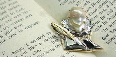 作品灵感来自于一颗偶然获得的珍珠。配合某个角度的光照,它非常像一位具有古典风格的肖像。机缘巧合,这枚珍珠,正好在莎士比亚诞辰400周年时被设计师找到,制成了这枚无法复制的胸针。摄影照片的背景是鲁迅先生的英文版文集。两位作家在时空和机缘还有设计师的尽心设计下,完成了一次遇见。
