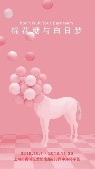 大面积粉色、梦境之马、气球、甜点……这些元素让每一位来到展览的参观者都游离于想象与真实的边界。这次展览也正是从貌似无意义的白日梦中撷取美妙片段,建构视、听、嗅、触、味觉的立体空间,重新唤起人们对童真、感性、灵敏、幻想的审视。