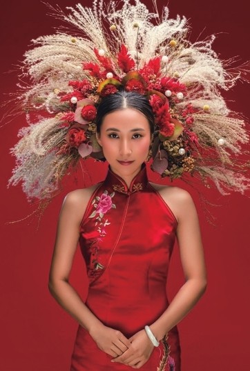其灵感来自京剧的头冠,通过花艺手法在头饰上展现中式花艺,配合旗袍来表现岁月如花的感受。