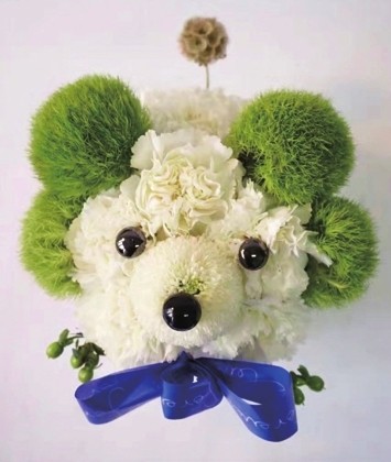 这个作品来源于设计师与一个小病友的情缘。小男孩病友很喜欢小狗,但因为生病的缘故不能养狗。设计师帮助他完成了心愿,通过花艺做了一个毛茸茸的小狗,也见证了小男孩收到它时那快乐幸福的笑容。
